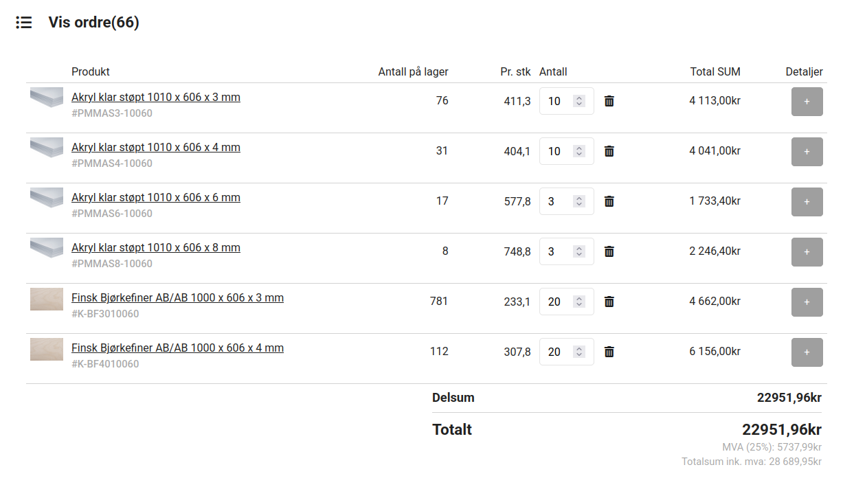 • Akryl: 3mm, 4mm er de vanligste. Har også noe 6mm og 8mm.